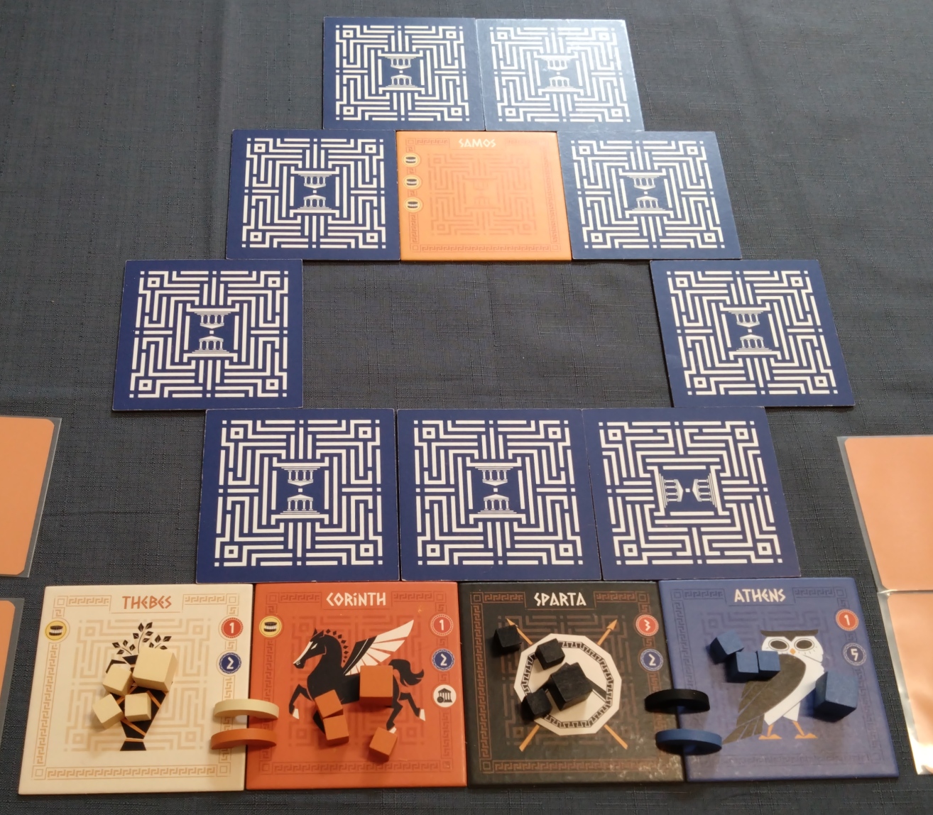 Corinth, Thebes, Sparta: + 2 blue commodities & + 1 coin without motive