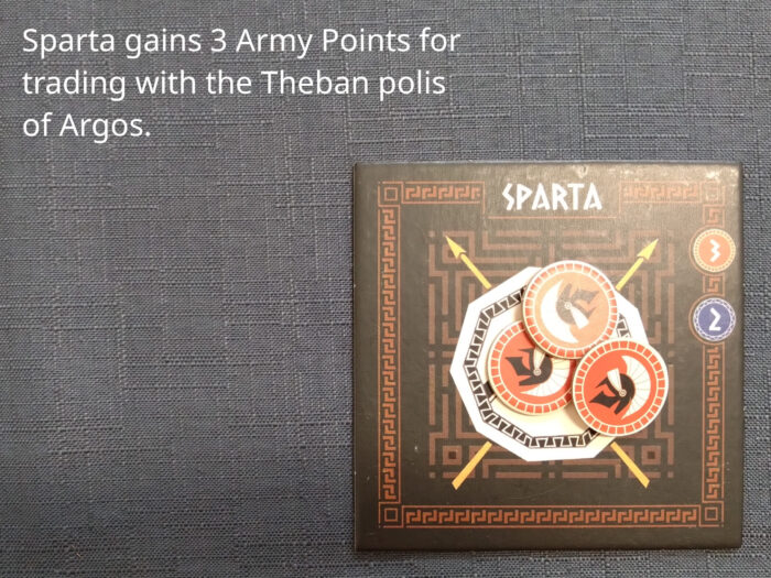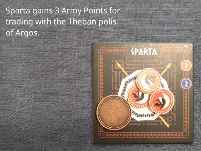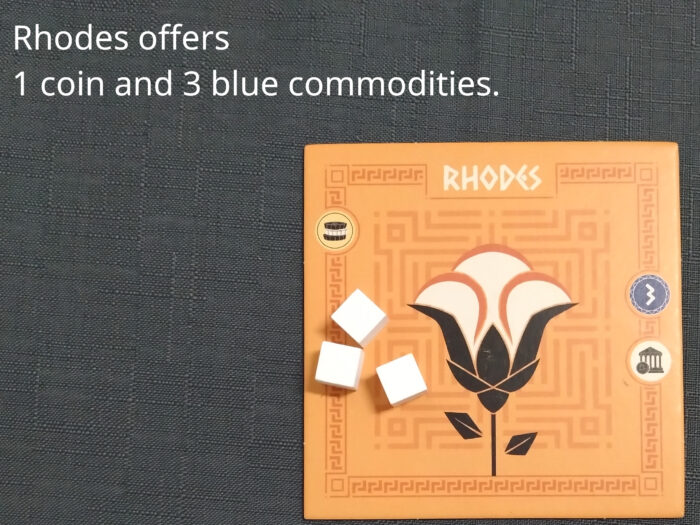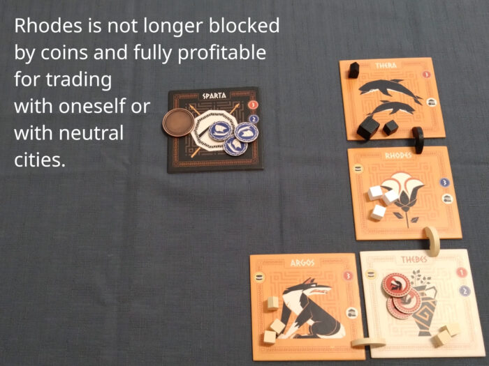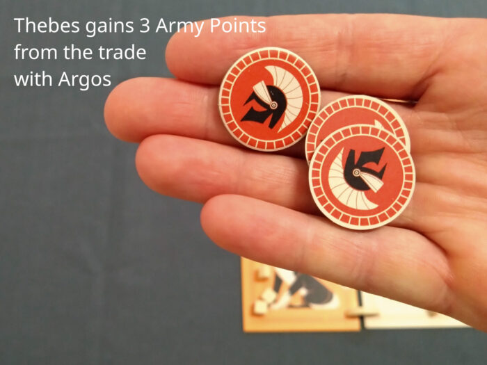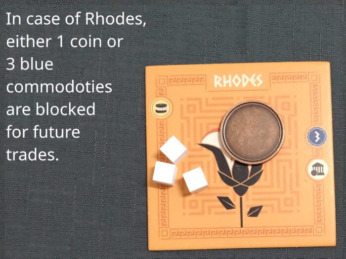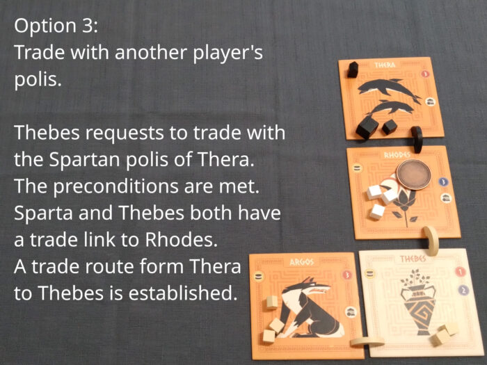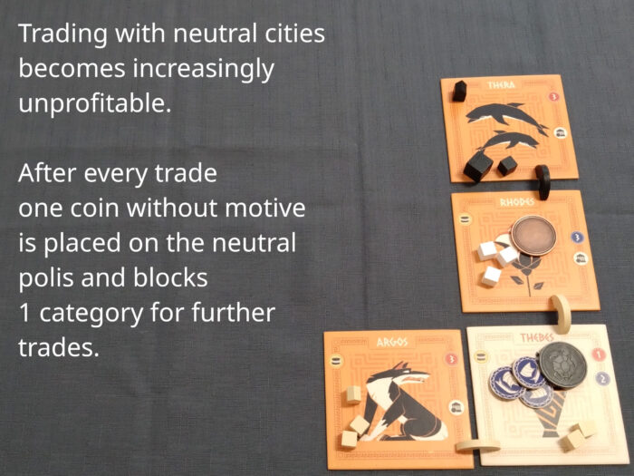 The third basic action is trade. Trade includes always a generation of commodities from one or two polis tiles. Exchange of commodities is not part of trade but dealt in addition in negotiations.